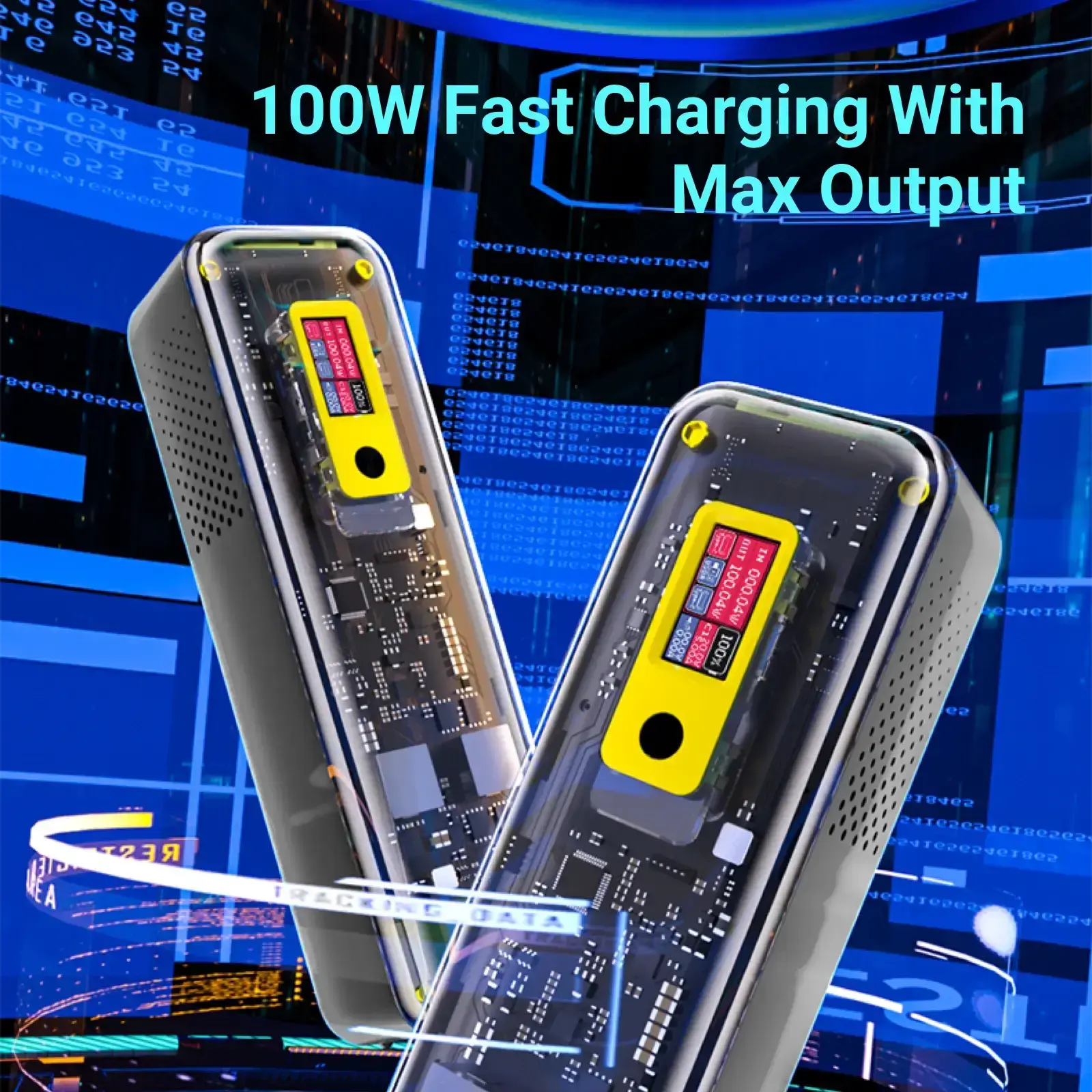 @Features Features 100W max output powerbank Charge three devices at a time LED screen that displays battery life Advanced cooling system World's first see-through power bank Widely compatible with iPhone(including the new iPhone 15 series), Android, iPad, laptop, AirPods, Switch, etc. |
