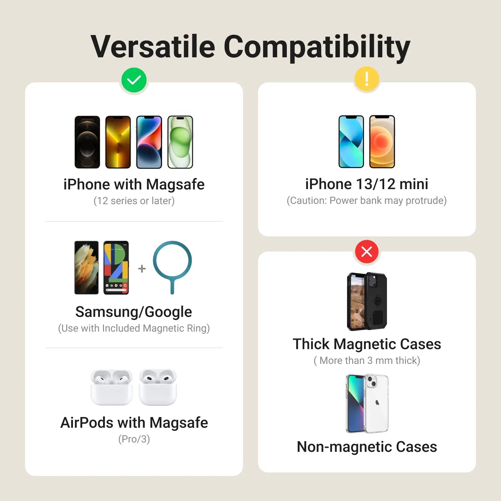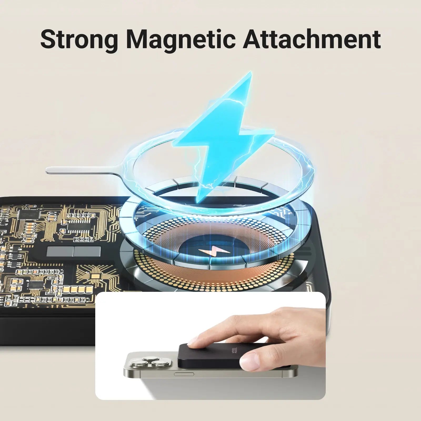 | @Features Features 18 built-in magnets provide instant MagSafe-style charging and cable-free convenience. 35% slimmer and 34% lighter than others, our magnetic wireless power bank is the perfect travel essential to keep your iPhone charged on the go. Real 5,000mAh power supply offers 19 hours of video playtime for iPhone 14 Pro Max. Small yet powerful, it's an airport essential. 10N magnets and free magnetic ring make our power bank 3.4 times stronger magnetically. Enables easy one-handed use and charging through case. Charges two phones simultaneously with 7.5W MagSafe-style wireless and 10W USB-C wired charging, perfect for sharing power on-the-go. The included phone stand transforms your power bank into a stand for browsing or FaceTiming, keeping your phone upright for a comfortable viewing angle. |